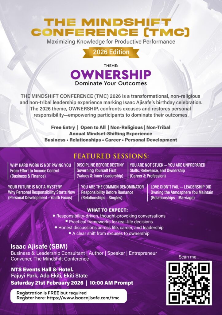 The Mindshift Conference (TMC) is an annual leadership and personal development experience curated as part of Isaac Ajisafe’s birthday celebrations. TMC brings together leaders, professionals, thinkers, and influencers to engage in transformative conversations that expand perspectives and equip participants to take greater responsibility in life.